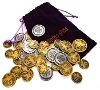 Pochette plastique contenant 1 bourse en tissu et 50 jetons métalliques.