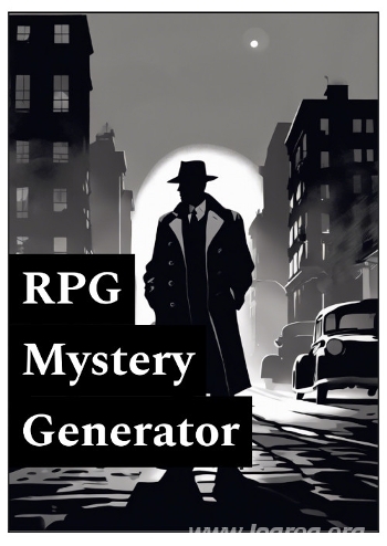 RPG Mystery Generator est un module permettant de générer un mystère à résoudre pour un jeu en solo ou en assistance pour le MJ souhaitant préparer un scénario d'enquête. Il ne prend pas de référence à un cadre particulier, les suggestions présentées en ouverture incluant aussi bien un roman noir à la Chandler, un whodunit à la Agatha Christie, ou une énigme dans un cadre médiéval.
