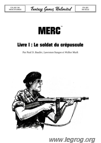 Le texte commence avec une Introduction (1 page) présentant le mercenariat (considéré dans un sens relativement large puisque incluant certaines troupes "régulières") et les termes utilisés dans la suite du livret. Le Personnage (The Character, 3 pages) explique d'abord comment le personnage est défini par une série de traits physiques (cheveux, yeux, etc.) pour lesquels le jeu propose des tables de génération aléatoire, puis par un jeu de caractéristiques (Force, Agilité, Intelligence, Connaissance, Instinct, Expérience Militaire Antérieure, sur une échelle 11-66 tirée avec deux dés à 6 faces, dizaines/unités). Le Spécialiste (4 pages) explique ce que chaque spécialité (22 missions dont Pilote, Expert en Démolition ou en Camouflage, en Armes Lourdes ou Arts Martiaux) apporte au profil du personnage, et enfin Capacités de Force (1 page) détaille les traits (capacité de transport, carrure) dépendant de la Force du personnage. Le Test (The Test, 6 pages) explique ensuite la procédure de jets de dés et les règles spécifiques (modificateurs, etc.) pour une série de types de tests (Détection, Evasion, Eclaireur, Furtivité, Intercepter les Messages, Déchiffrer, Dissimulation, Poser/Désamorcer des Explosifs ou des Pièges Non-Explosifs), et propose un exemple de création de personnage, avec la fiche de celui-ci remplie.