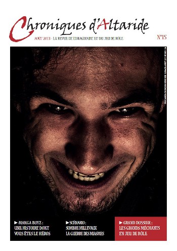 Ce numéro 15 de la revue rôliste mensuelle vous invite à rencontrer les grands méchants. Qui sont-ils ? Comment les gérer ? À quoi servent-ils ? Ce sont les Chroniques d’Altaride les plus épaisses depuis leur création : plus de cent pages ! Au programme, des rencontres avec des auteurs, des aides de jeu, nouvelles et réflexions sur le thème du mois, une histoire dont vous êtes le héros dans l’univers de Manga BoyZ offerte par l’auteur du jeu et un scénario inédit pour Sombre - Millevaux écrit lui aussi par l’auteur du jeu !