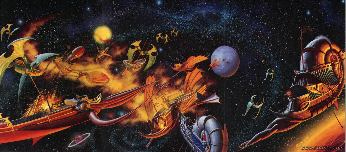 Cet écran à trois volets pour SpellJammer rassemble toutes les tables nécessaires à la gestion des parties, y compris les informations spécifiques à cet univers comme les caractéristiques des vaisseaux spatiaux. Côté joueur, il représente une scène de bataille spatiale.