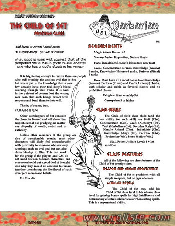 Formant la branche armée du culte stygien du dieu-serpent, les "enfants de Set" sont de redoutables combattants maîtrisant des techniques de combat proches de celles des pirates mais renforcées par une certaine connaissance de la sorcellerie. Au fil de leur progression, les enfants de Set s'inspirent des reptiles si chers à leur divinité et acquièrent des traits traditionnellement associés aux serpents, comme une grâce et une agilité surnaturelles et une aura leur permettant de charmer ou d'intimider plus facilement leurs adversaires.