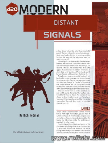 Conçu pour des personnages de niveau 3, Distant Signals est le troisième volet de la série Grim Frequencies. Dans cette aventure, l'un des PJ découvre dans ses poches les clefs d'un camion et une mystérieuse note lui enjoignant de livrer la cargaison de ce camion (du matériel de cinéma) jusqu'au lieu de tournage d'un film. Comme dans les épisodes précédents, tout refus de la part des héros aura des conséquences fâcheuses, différents accidents et coïncidences venant rapidement leur rendre la vie impossible.